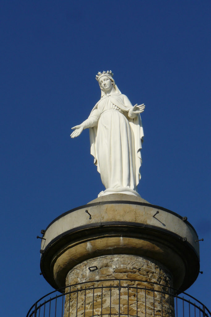 La tour mesure 15 mètres de hauteur, la vierge 3 mètres et pèse 2000kg. Elle a été sculptée par M. Fabische qui avait sculpté la vierge de Notre Dame de Lourdes.